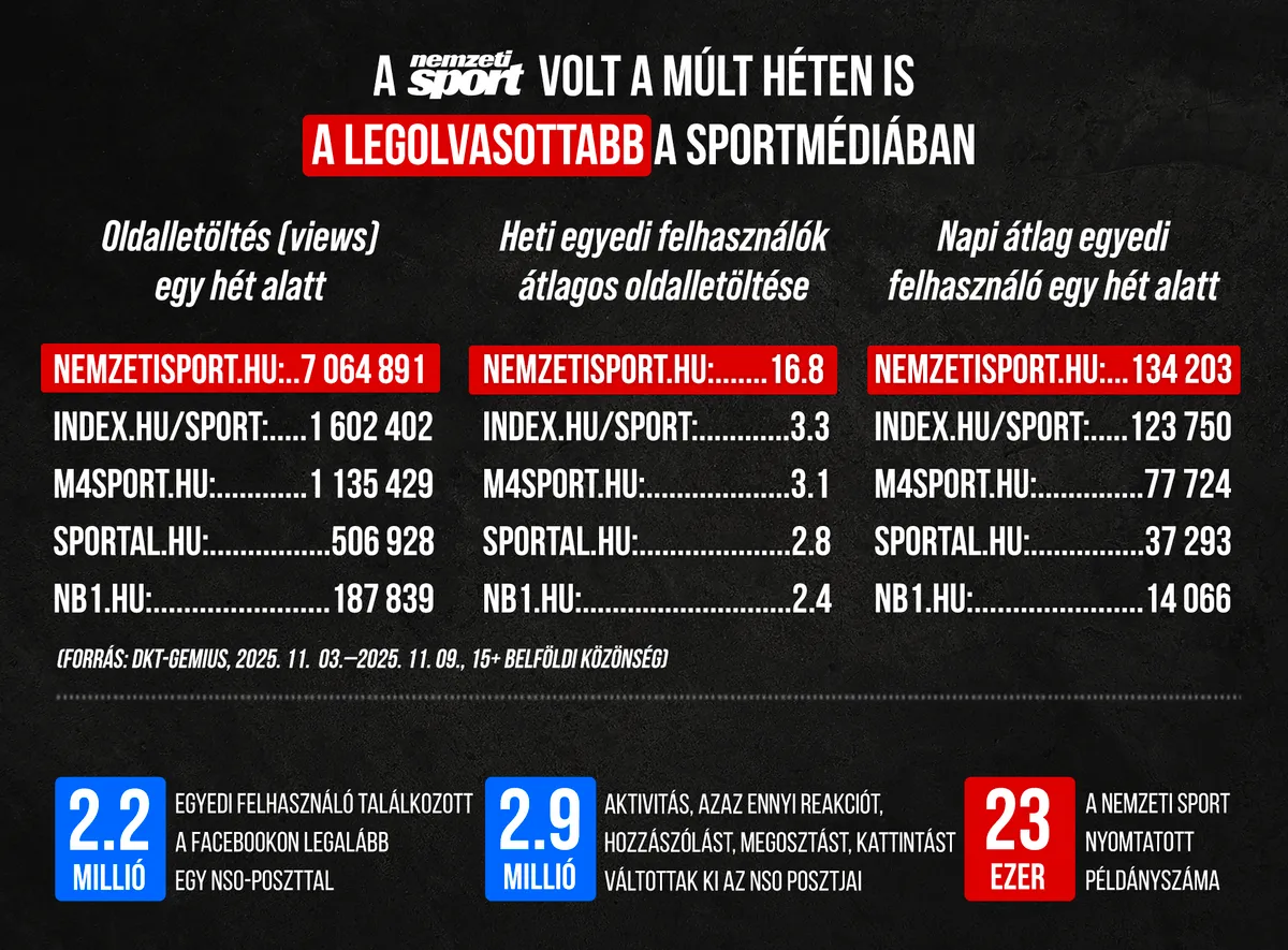 A 2025-ös év 45. naptári hetében is a Nemzeti Sport Online volt a magyar sportrajongók legolvasottabb honlapja. A november 3-tól november 9-ig tartó időszakban több mint 7 millió oldalt töltöttek le felhasználóink. A Nemzeti Sport a közösségi médiában is népszerű, több mint 2.2 millió felhasználó találkozott a posztjainkkal (a múlt hónap átlagos napi nyomtatott példányszáma 23 373).