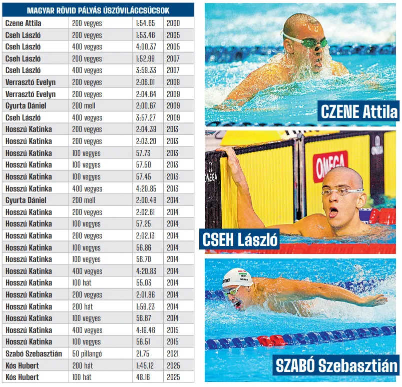 Vegyesen viszont! A hagyományosan legmagyarabb úszásnem öröklistái 50 és 25 méteres medencében is roskadoznak a mieinktől, rövid pályán például mindjárt az első magyar csúcs is a 200 vegyesé: Czene Attila 2000 tavaszán Minneapolisban beállította az 1:54.65-ös csúcsot. Később Cseh László 2005-ben (1:53.46) és 2007-ben (1:52.99) is világrekorddal nyert Európa-bajnokságot. Négyszázon pedig Cseh 2005 és 2009 között három Eb-n győzött világcsúccsal, a 2007-es idő (3:59.33) az első, négy percen belüli 400 vegyes volt az úszás történetében.